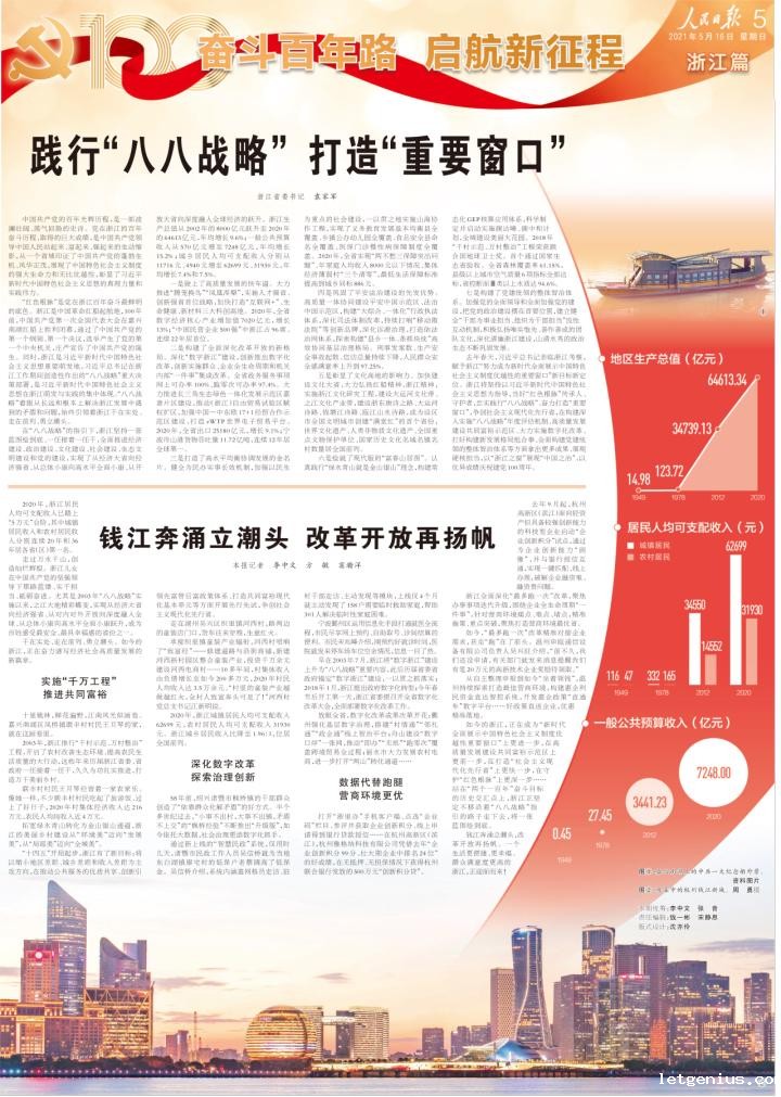 一是驶上了高质量发展的快车道。大力推进“腾笼换鸟”“凤凰涅槃”,实施人才强省、创新强省首位战略,加快打造“互联网+”、生命健康、新材料三大科创高地。2020年,全省数字经济核心产业增加值7020亿元,增长13%;“中国民营企业500强”中浙江占96席、连续22年居首位。