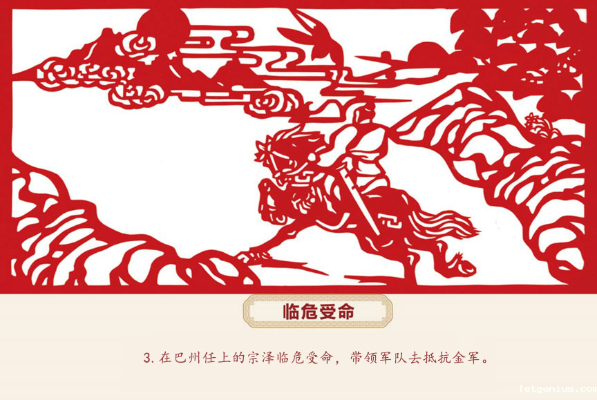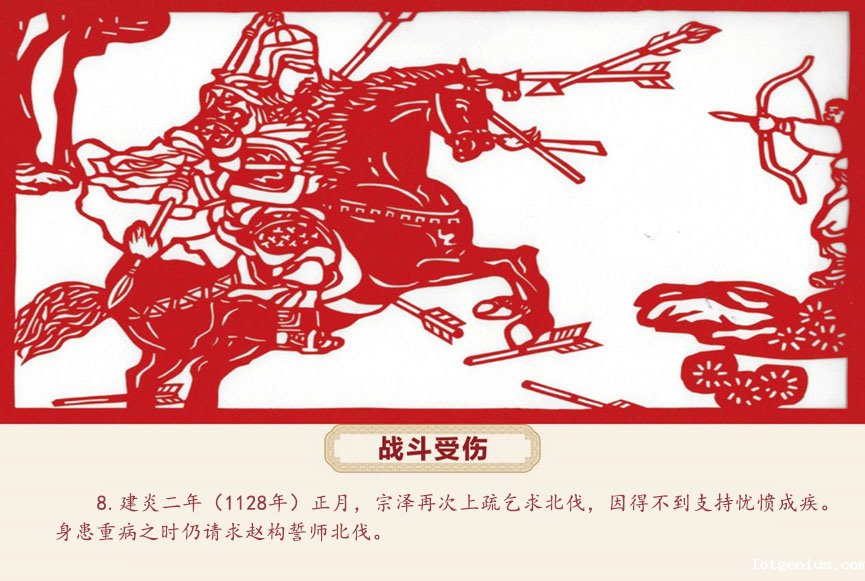 宗泽在粉碎金兵冬季大规模攻势之后,金兵被迫退守,形势对抗金有利,北伐时机已经成熟。建炎二年(1128年)正月,宗泽再次上疏乞请高宗北伐。宗泽忠心耿耿效力宋王朝,却得不到高宗的理解和支持。眼看六月进兵渡河计划已成泡影,一切努力都付之东流,宗泽忧愤成疾,疽发于背。诸将前来探望,宗泽说:“我的病是由于不能北伐积愤所致。你们如能继承我的志愿,我虽死无恨。”将领们都感动得流下眼泪,齐声道:“我们一定尽力报国。”诸将离开后,宗泽心潮澎湃,感慨万千,不由吟起了杜甫的名句:“出师未捷与先死,长使英雄泪满襟。”