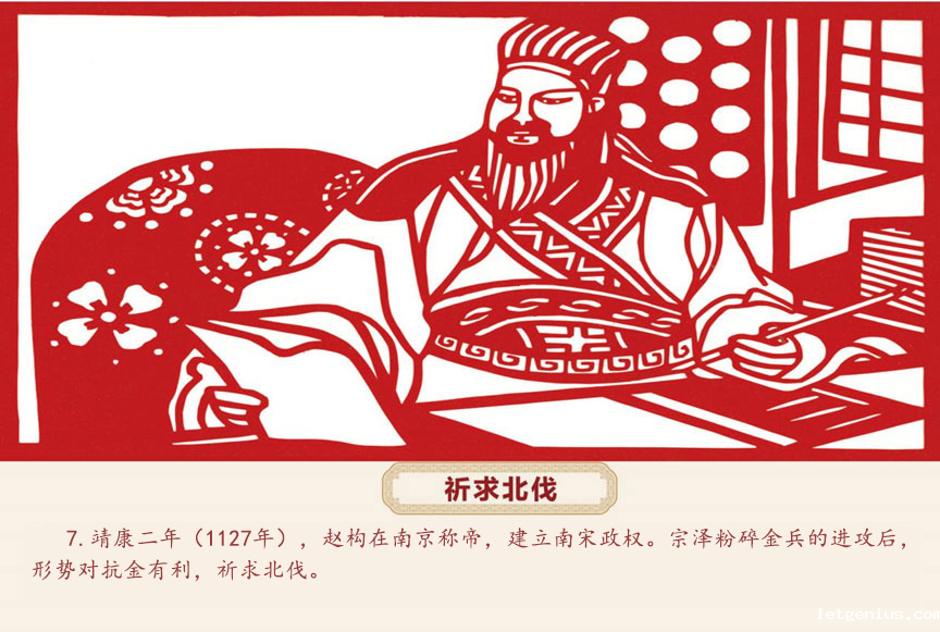 赵构在南京即帝位,宗泽入朝相见,涕泪交流,提出复兴国家大计。宗泽力主抗金,不断上书陈说中兴拨乱大计,希望高宗担负起“嘉靖中兴之事,戡除外侮之凶残”的重任,猛烈抨击割地求和的主张。