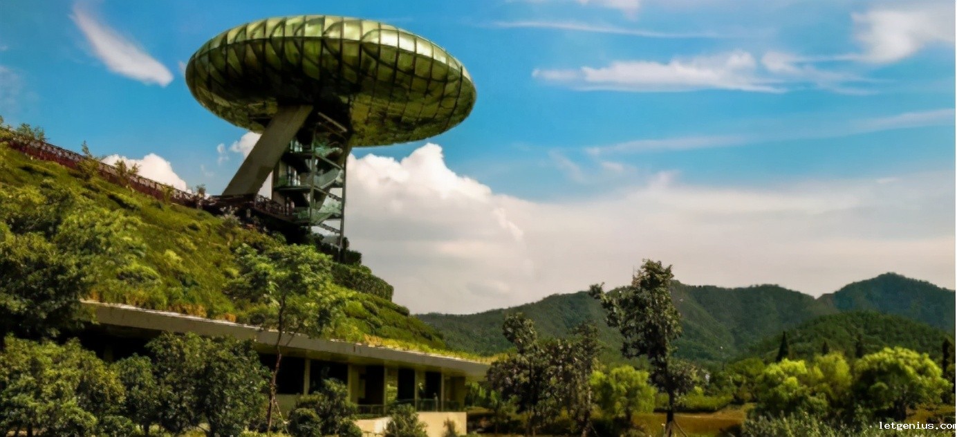 中国湿地博物馆在建筑造型采用“铺满植被的山丘”的意象,以形似山丘的自然造型为其建筑形态,同时在建筑屋顶和外立面上种植绿色植被,巧妙将其隐藏在西溪湿地郁郁葱葱的自然环境之中,实现了人工建筑与自然环境的融合,给建筑带来了一种鲜明的场所感。在建筑上设计了一座以“湿地新芽”为造型意象的高约30米的扁球形观光塔,建筑材料采用了玻璃和钢材,使得建筑立面视觉通透,让参观者可以通过其登高眺远,俯瞰西溪湿地全景。同时,展现出矶崎新独特建筑语言的观光塔的辨识度极高,以此成为博物馆的标志。