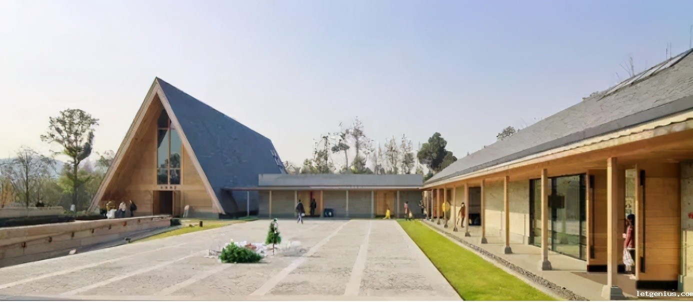 良渚博物院选址位于山谷地带,一条溪流将其四面环绕。为了呼应与契合了山形走势和溪水流向的环境特征,建筑形态采用具有强烈方向感的长方形错位布局。在此基础上,大卫·奇普菲尔德将建筑造型与“一把良渚玉锥撒落在大地上”联系起来,给人以无限的遐想。简洁而纯粹的长方形体块构成也在传递出博物馆是“收藏珍宝的盒子”的理念。四个宽度18米但高度不一的的单层建筑体块高低错落且不平行的并置,削弱了建筑的体量,外墙材料采用了伊朗的黄洞石。整体建筑远观宛如玉质般的现代几何雕塑。