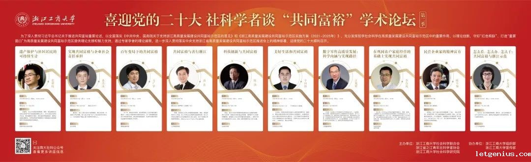 为了深入贯彻习近平总书记关于推进共同富裕重要论述,以实际行动迎接党的二十大顺利召开,2022年4-5月,由浙江工商大学社会科学联合会、浙江省之江青年社科学者协会、浙江工商大学社会科学研究院联合主办、浙江工商大学组织部、宣传部协办的”喜迎党的二十大 社科学者谈‘共同富裕’学术论坛“第二季于线上线下成功举办。清华大学陈劲教授等9位知名学者应邀为全校师生作报告,线上千余师生参加论坛交流,论坛主报告由浙江工商大学社会科学研究院副院长柴斌锋主持。