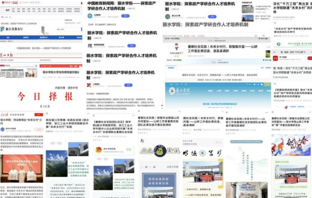 研究团队将“创造性智慧劳动助力乡村振兴的实践与创新”作为研究方向,积极探索社科赋能实践和基于课程思政的劳动教育,两年间带领学生走遍丽水9个县市区,开展创造性智慧劳动助力乡村振兴活动,深入山区开展“智慧劳动 数商赋能 乡村振兴”调研服务,赴对接县调研农村电商模式渠道和专业人才、“村播”“山播”、共富工坊、农产品电商化等内容,参与了“山区 26 县”生态产业电商直播启动仪式、中国(丽水)农村电子商务大会等活动;师生们还跟着村支书走入田间地头,走进农产品加工中小企业,进行政策宣传、数字乡村设备使用讲解、乡村振兴劳动人故事收集、农产品电商平台推广等活动。