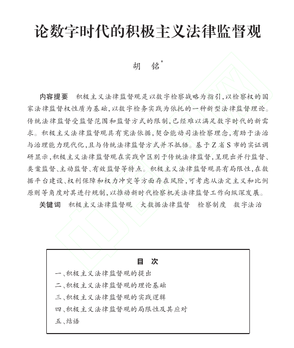 近日,浙江大学数字法治实验室胡铭教授的研究成果《论数字时代的积极主义法律监督观》在《中国法学》上发表。该研究基于Z省S市的实证调研显示,积极主义法律监督观在实践中区别于传统法律监督,呈现出并行监督、类案监督、主动监督、有效监督等特点。积极主义法律监督观具有局限性,在数据平台建设、权利保障和权力冲突等方面存在风险,研究认为可考虑从法定主义和比例原则等角度对其进行规制,以推动新时代检察机关法律监督工作向纵深发展。