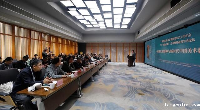16下午,全体与会专家围绕“中国艺术精神与新时代中国美术教育”的主题展开圆桌研讨。教育部美术学教指委副主任委员、北京大学教授丁宁主持研讨。教指委委员们在党的二十大提出的要把教育变成美育的精神指引下,以新文科建设为背景,从与科技结合的角度,就中国当代高校美术教育展开热烈讨论。
