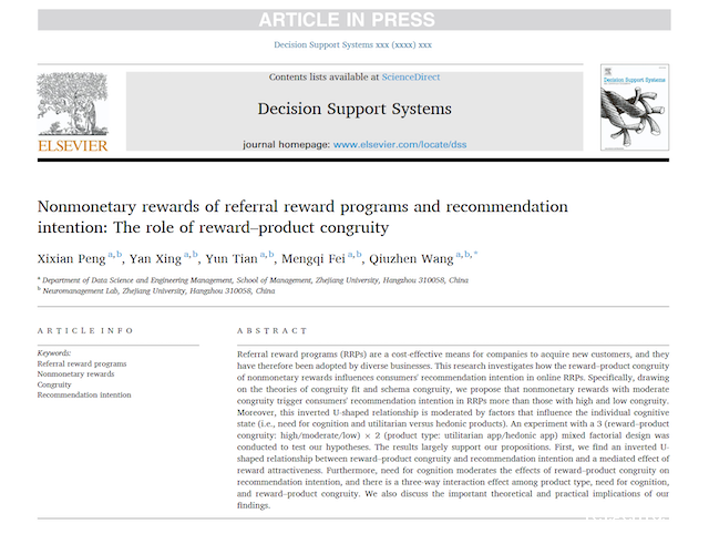 近日,浙江省哲学社会科学试点实验室浙江大学神经管理学实验室彭希羡、邢妍、田韵、费梦琪和王求真研究员共同完成的论文Nonmonetary rewards of referral reward programs and recommendation intention: The role of reward–product congruity在线发表于信息系统领域高水平学术期刊Decision Support Systems上(国际信息系统协会AIS认定的CSS顶级期刊之一,澳大利亚商学院院长联席会议ABDC认定的最高A*级期刊,JCR的Q1区,SCI&SSCI双检索期刊,2021年影响因子6.969,五年影响因子8.191)。