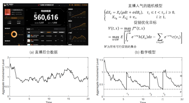 (a)为某直播间后台人气、销量的数据;(b)为直播人气随机模型和促销优化目标函数;(c)为人气随机模型的一次仿真模拟;(d)演示了阈值策略下的促销行为如何影响人气变化。