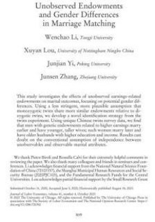 成果简介:该成果探讨不可观测的收入相关禀赋对婚姻结果的影响,特别关注 性别之间的差异。发现具有较高收入潜力的个体在教育方面的投入更 高;男性具有较高收入潜力的个体通常较早结婚,配偶年轻且身高较高; 女性则较晚结婚,配偶年龄较大且教育和收入水平较高。该研究首次质 疑了婚姻匹配模型中普遍假设的可分性,提供了未观察到的遗传禀赋与 观察到的婚姻属性相关的实证证据,强调在估计婚姻匹配模型时,需要 在可分析性和现实性之间取得平衡。