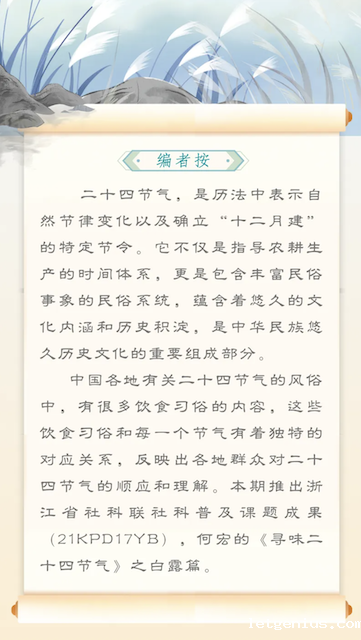 我国古代民间在白露节气有“收清露”的习俗,明朝李时珍的《本草纲目》上记载:“秋露繁时,以盘收取,煎如饴,令人延年不饥。”“百草头上秋露,未唏时收取,愈百病,止消渴,令人身轻不饥,肌肉悦泽。”“百花上露,令人好颜色。”因此,收清露成为白露最具节气特征的一种“仪式”。