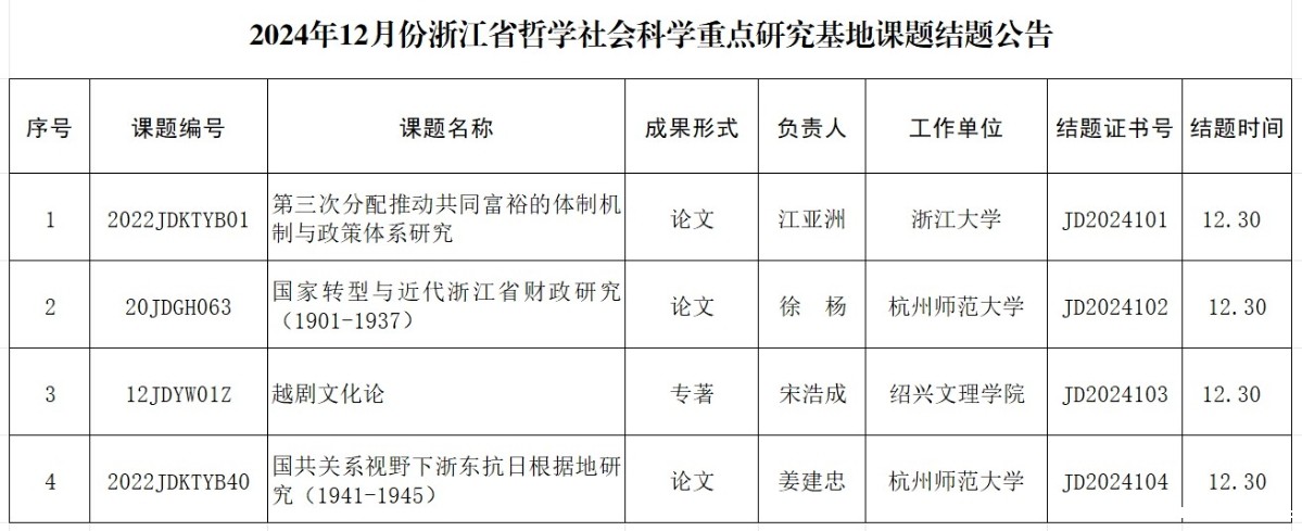 2024年12月份浙江省哲学社会科学重点研究基地课题结题公告